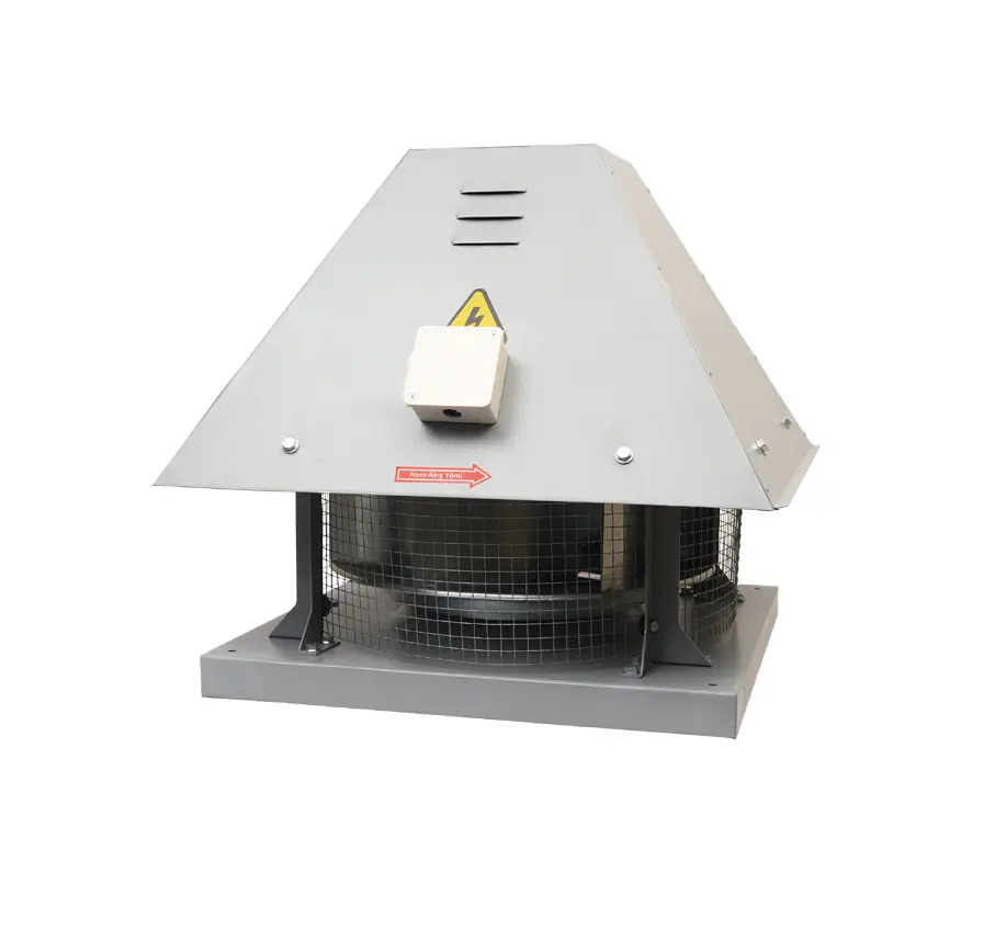 Radyal pervaneli, yatay atışlı, harici direkt akuple motorlu ve prizmatik şapkalı fan.